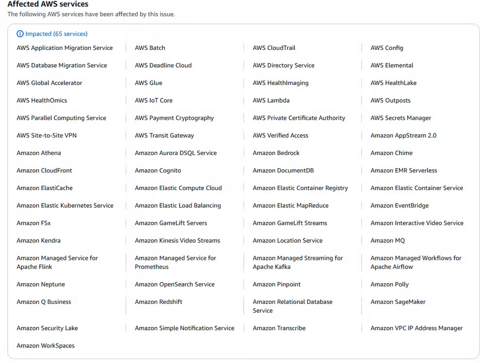 A mesma página menciona ainda que, além do DynamoDB, mais de 60 produtos da AWS foram afetados, todos localizados na região US-EAST-1 (veja na imagem abaixo). Até as 10h40 desta segunda, 37 serviços da AWS estavam classificados como resolvidos, de acordo com a empresa.
